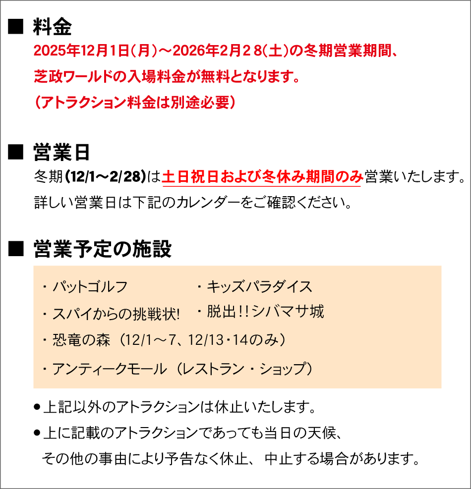 芝政ワールド冬期入場料無料