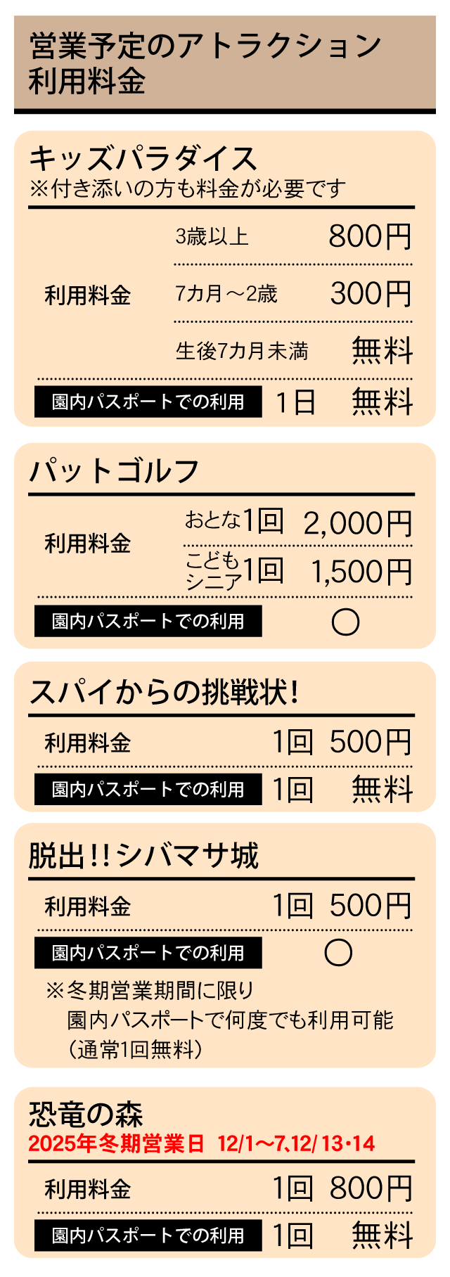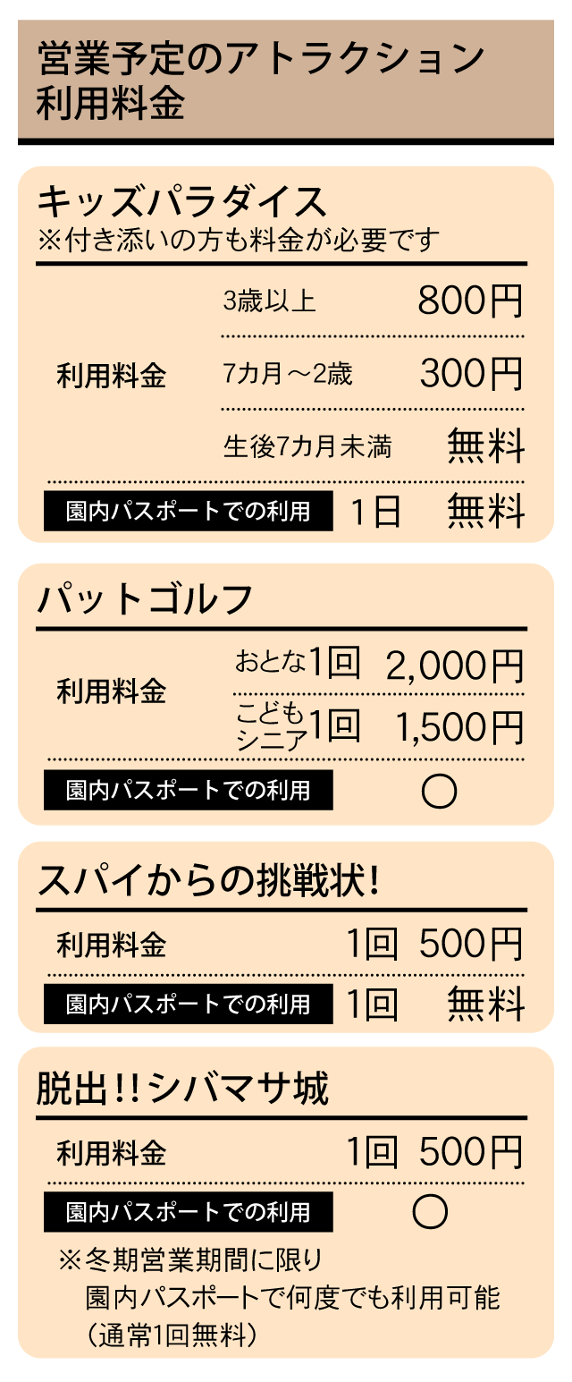 ※上に記載のアトラクションであっても当日の天候、その他の事由により予告なく休止、中止する場合があります。