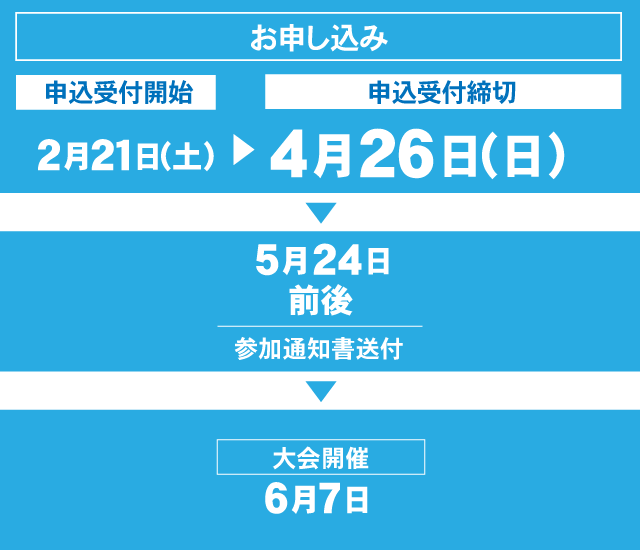 パソコンまたは携帯端末から下記のURL(外部リンク)にアクセスし、大会エントリーページの指示に従ってお申込みください。